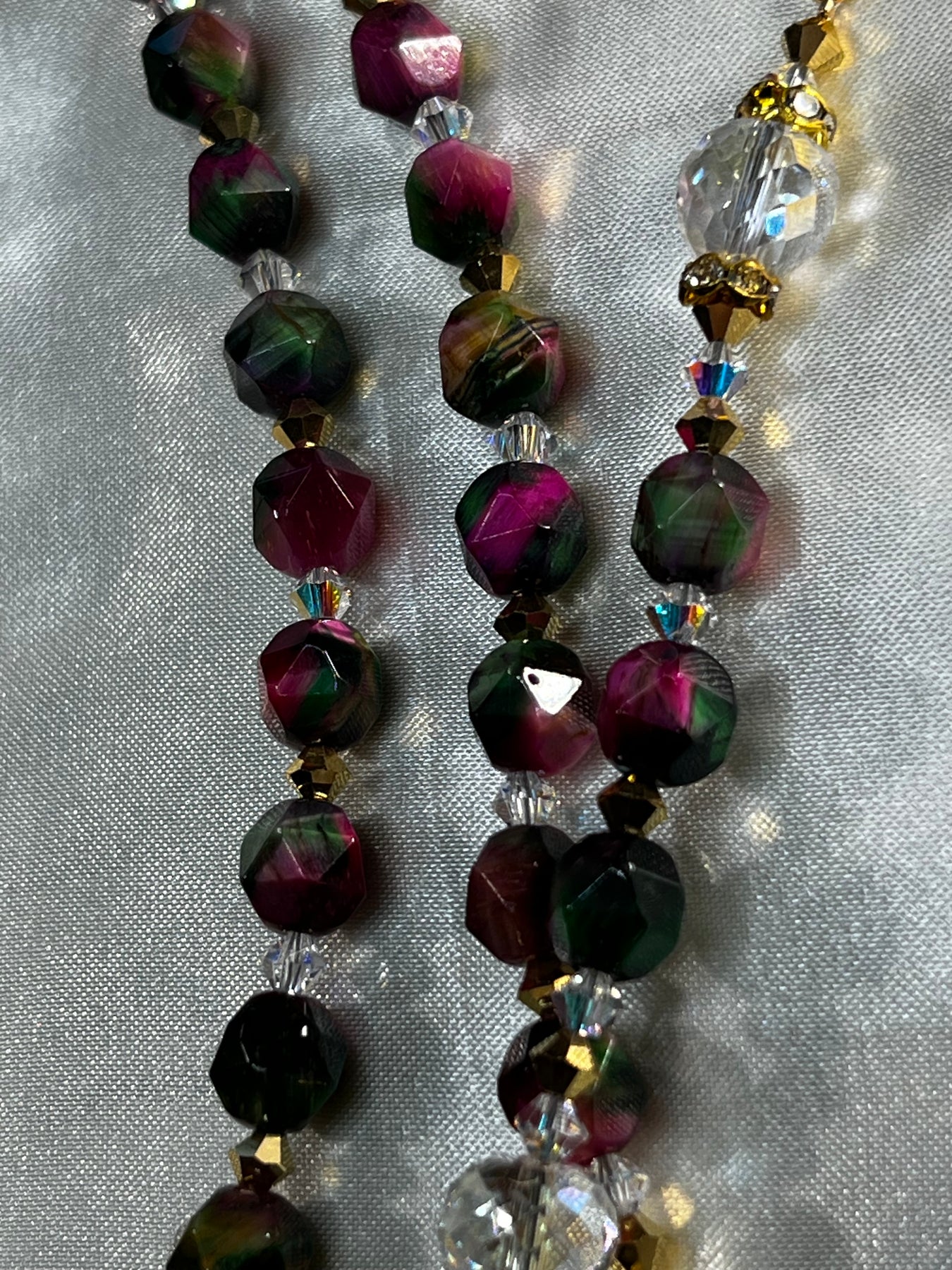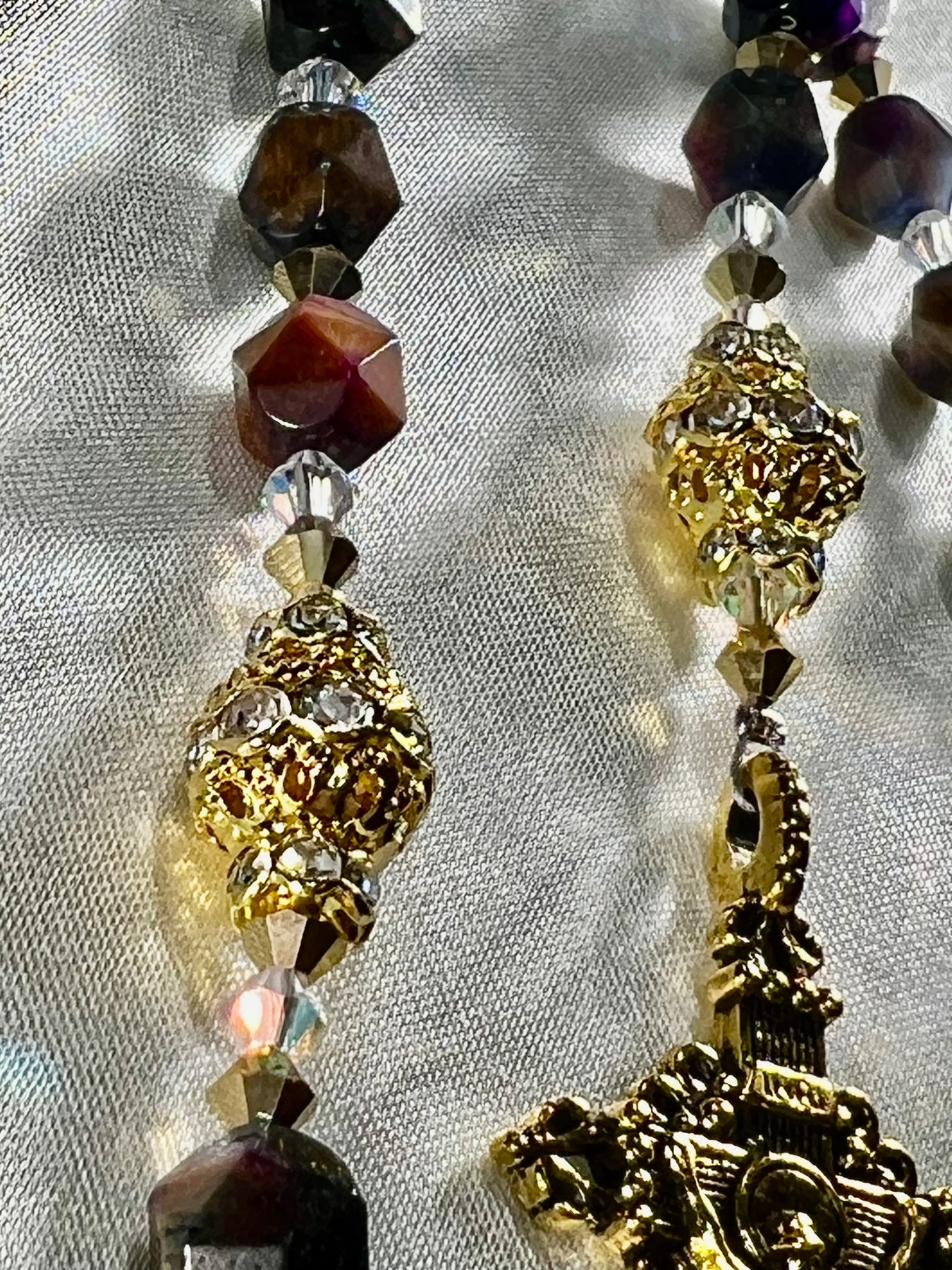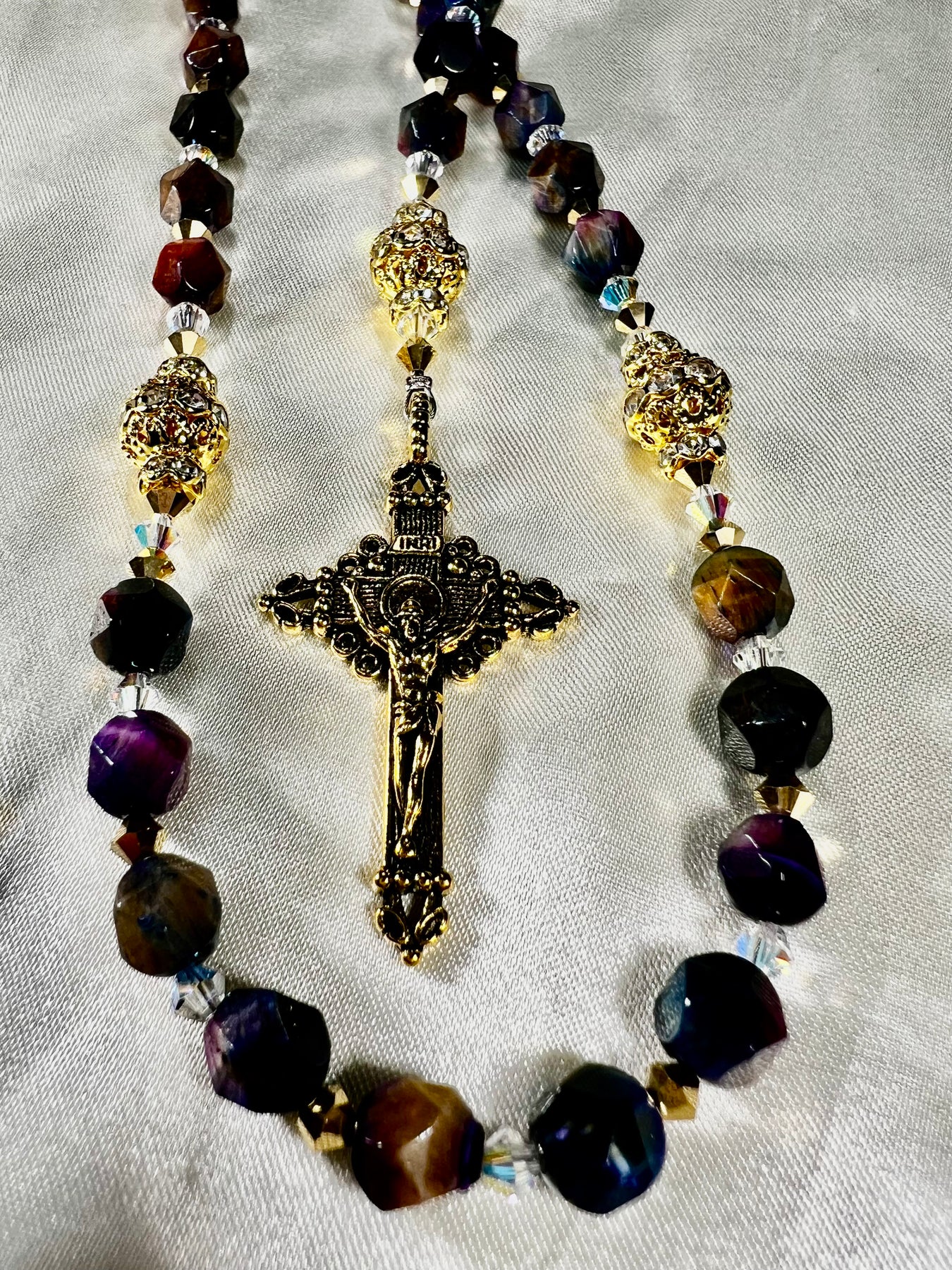 This Rosary is made with Pink/Green & Jeweled Tone Tiger Eye Gemstone Star Cut Faceted beads, Swarovski AB Crystal & Gold spacer beads, Rhinestone spacer beads, Pear Preciosa/Chandelier Gold Pater (Our Father) beads, Beadalon Wire, Gold Immaculate Mary Centerpiece & Gold Crucifix. This Rosary is 20.5" Long.