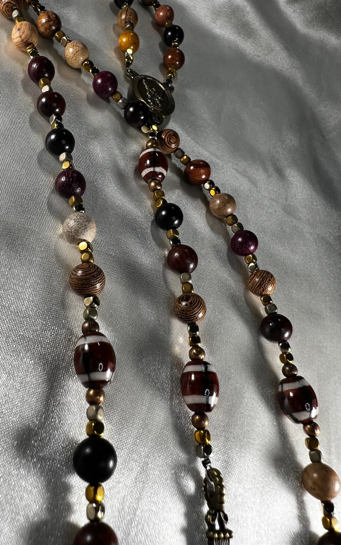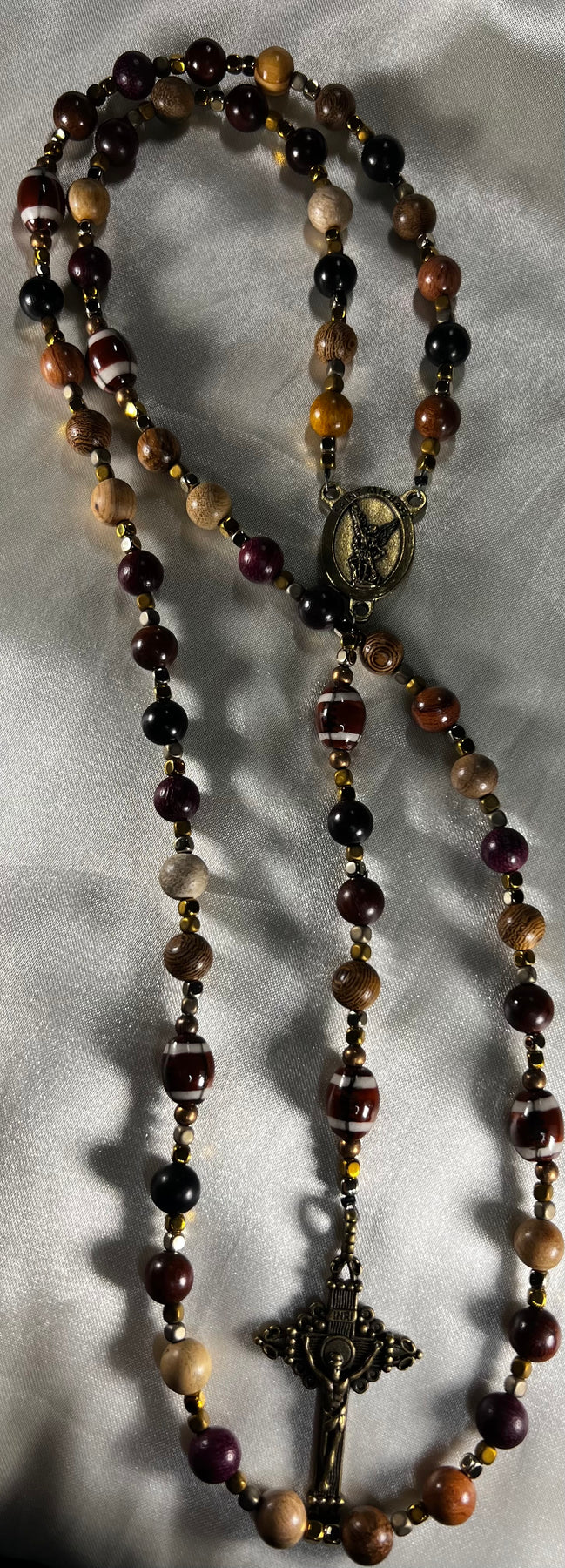 This Rosary is made with Multi Colored Wooden beads, Glass Football PTER (OUR FATHER) beads, Gold Metal spacer beads, Beadalon wire, Bronze St. Michael Ecnterpiece & Bronze Crucifix.